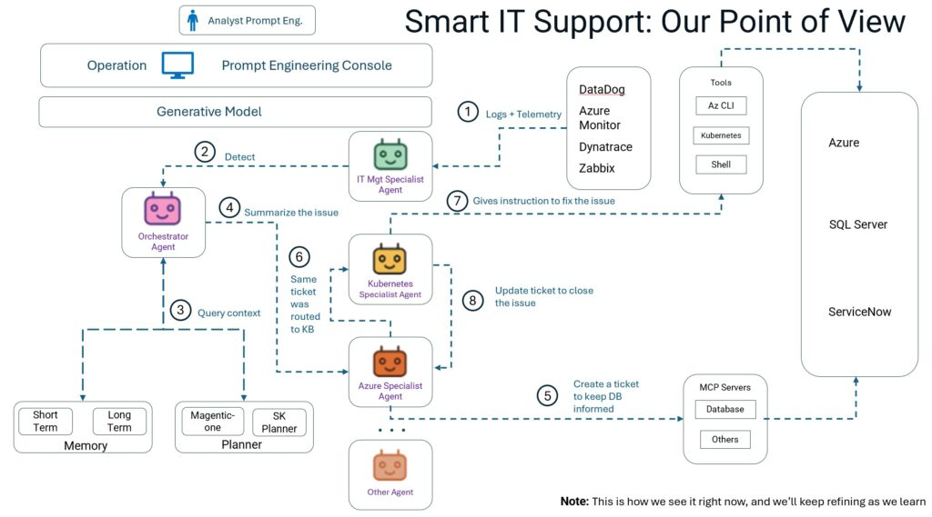 Imagine dois agentes de IA trabalhando juntos para resolver problemas de TI. Um detecta uma falha no seu cluster do Microsoft Azure Kubernetes Services (AKS) e abre um chamado. O outro, especialista em AKS, analisa e corrige o problema. Tudo acontece instantaneamente, sem espera, sem repasses, sem perda de contexto. Um terceiro agente atualiza o banco de dados de configura??o. Essa abordagem colaborativa entre agentes de IA está otimizando opera??es com IA ao eliminar atritos e acelerar a excelência operacional.