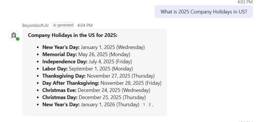 Criamos uma solu??o simples com o Microsoft 365 Copilot, combinada com prompts desenvolvidos por nós. Chamamos de Beyondsoft.AI. Uma ferramenta que nos auxilia no dia a dia. Em vez de procurar arquivos manualmente ou perguntar para alguém no Teams, os colaboradores consultam o Beyondsoft.AI e recebem respostas rápidas.
