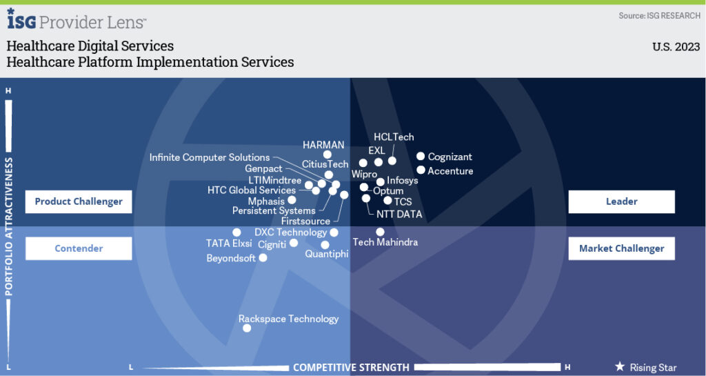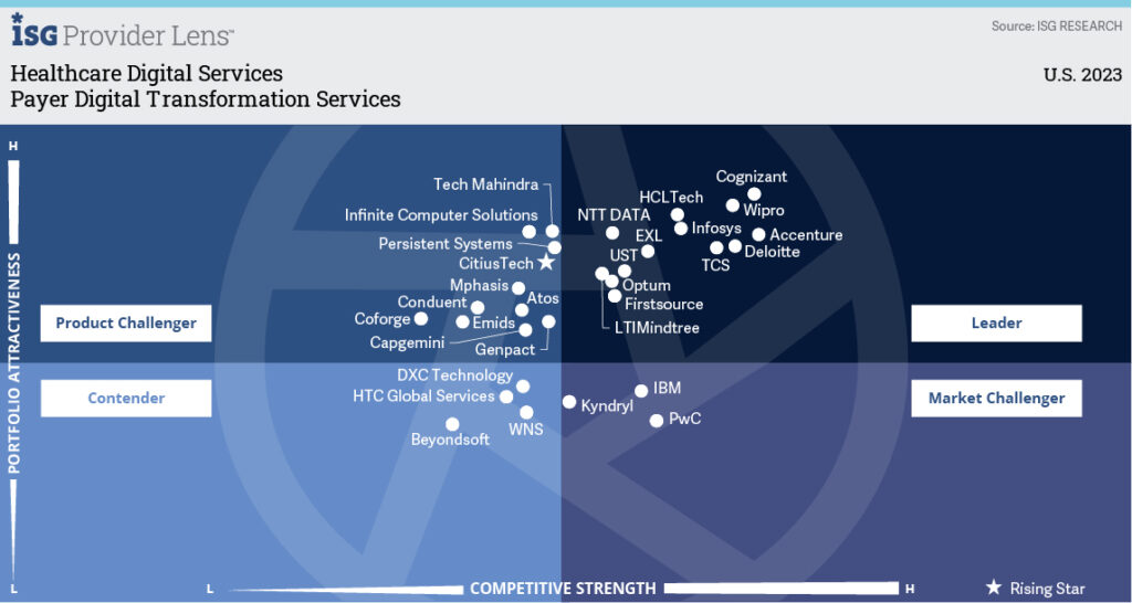 We were featured in the 2023 ISG Provider Lens? report on U.S. Healthcare Digital Services as a contender in two critical categories – Healthcare Platform Implementation Services and Payer Digital Transformation Services.